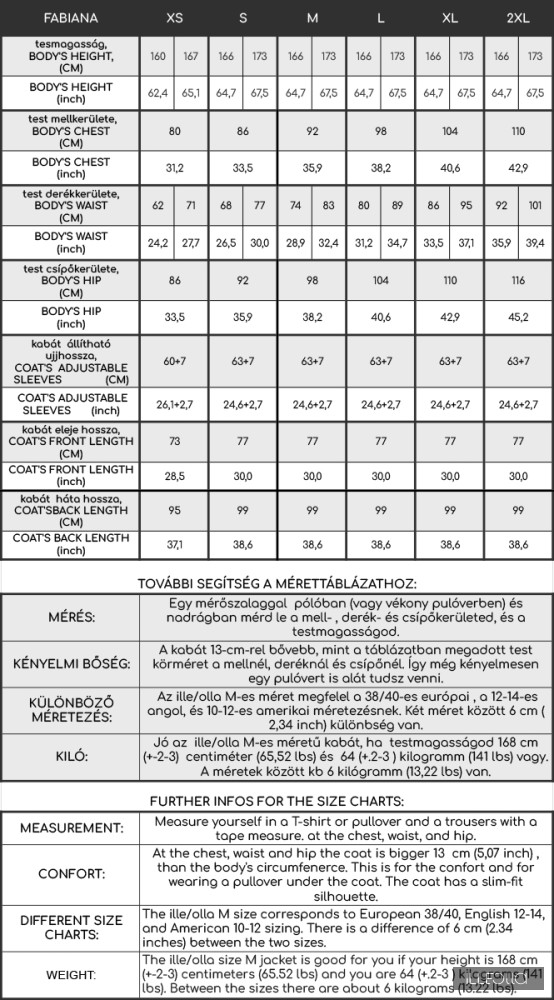 - a képek között megtalálod a mérettáblázatot, ezt a kabátot s-xl méretig gyártjuk